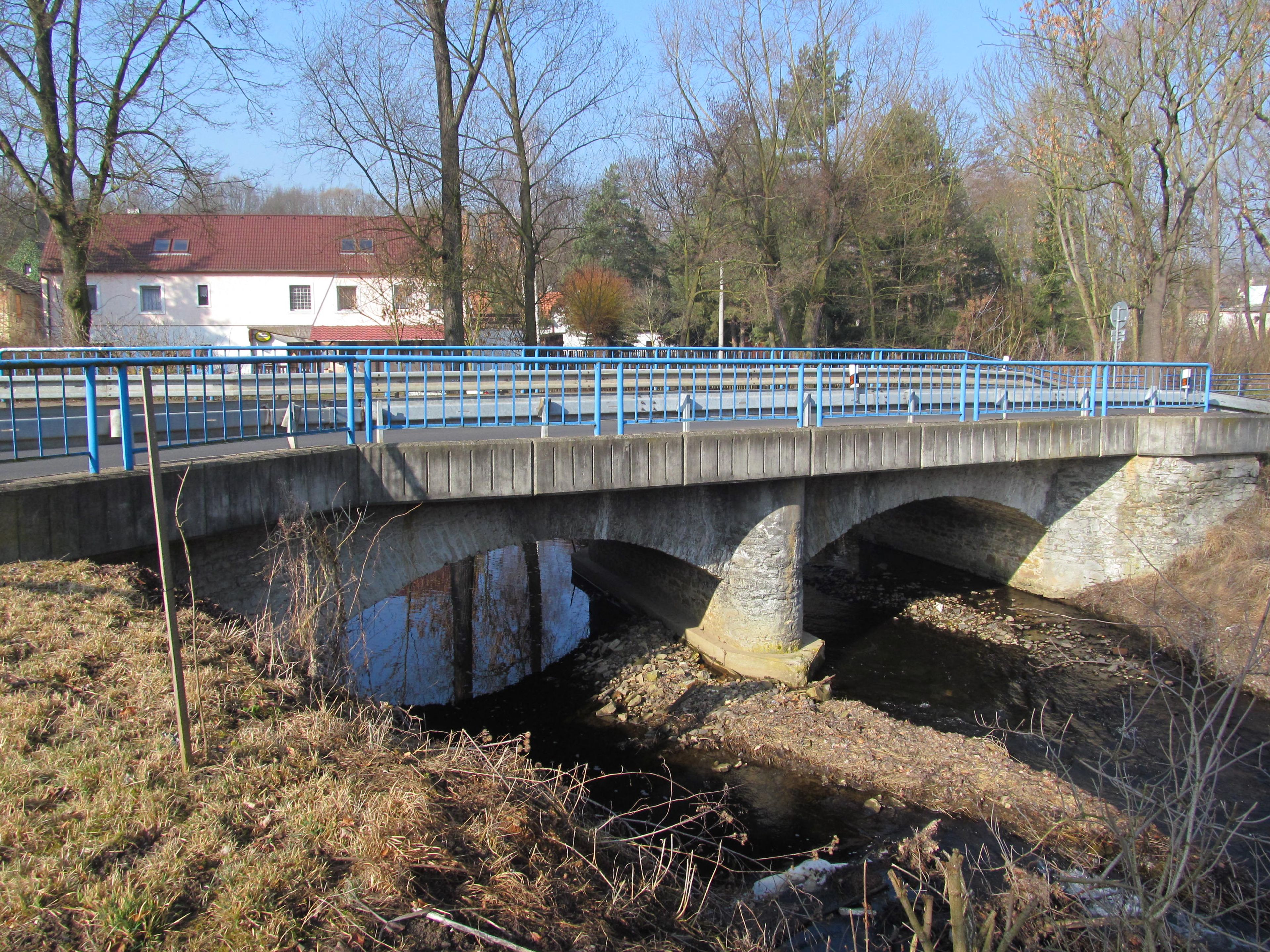 Stone bridge in Rvenice, kamenný obloukový most silnice III/2508 přes Chomutovku ve Rvenicích, části města Postoloprty