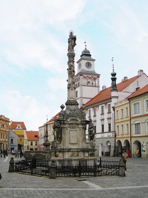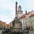 The Maria Column stands tall in the center of Třeboň, featuring detailed stone carvings and a statue representing the Virgin Mary at its summit.