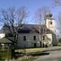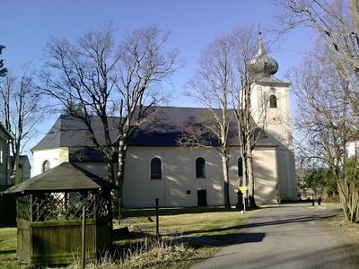 The stone church stands with its structured facade, bell tower, and traditional architectural elements characteristic of Czech religious buildings in Karlovy Vary Region.