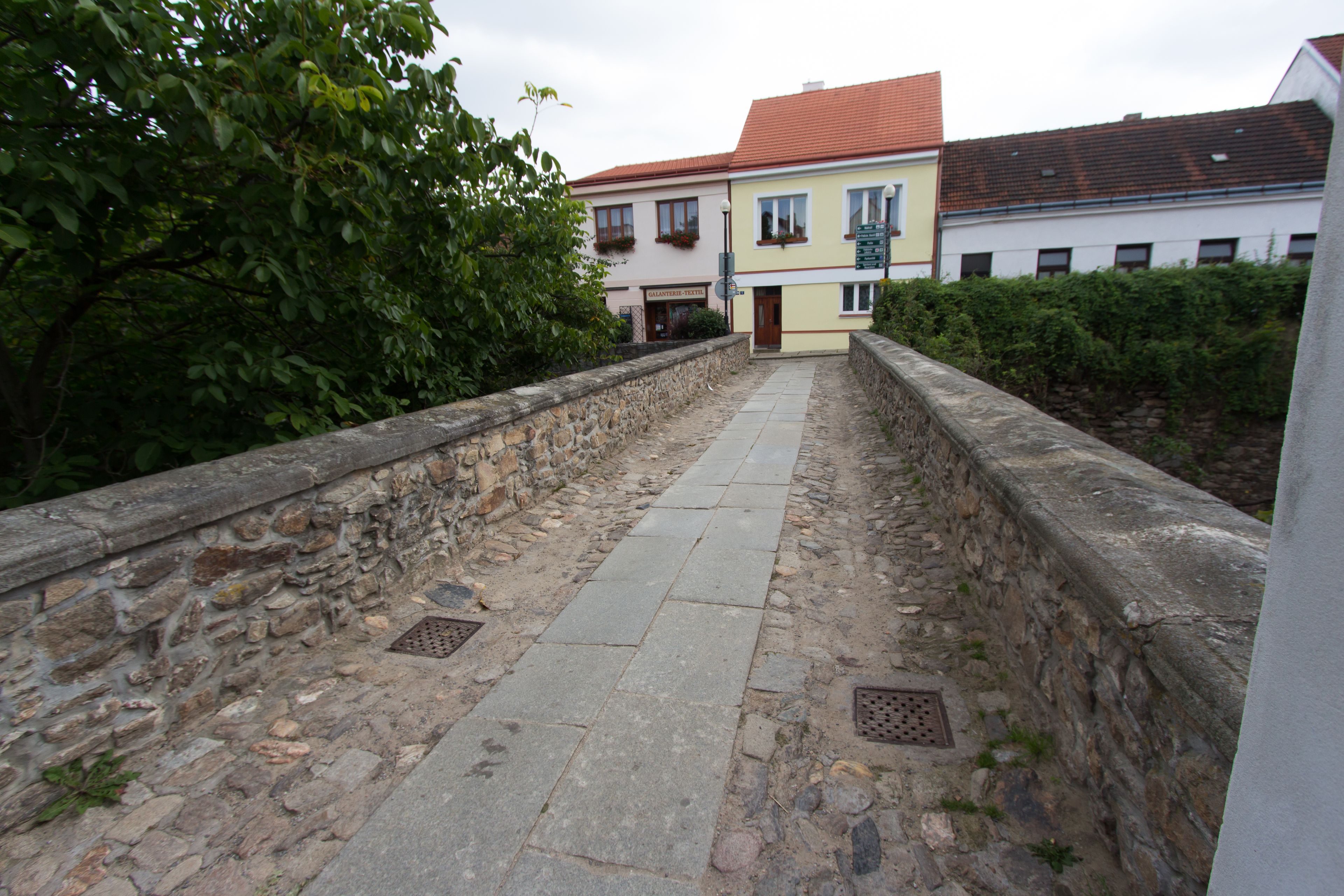 Bridge of Na Můstku street over the moat in Telč, kamenný tříobloukový most