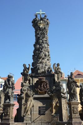 The monument displays traditional Czech Baroque sculptural work, representing religious devotion through carefully carved figures of saints and the Holy Trinity.
