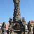 This stone column stands in Náměstí Svobody square, featuring statues of saints and religious figures arranged in multiple tiers around a central pillar.