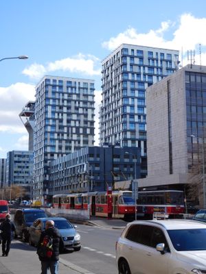 The Garden Towers consists of a five-story block foundation with five square towers extending upward to reach eighteen floors each at their highest points.