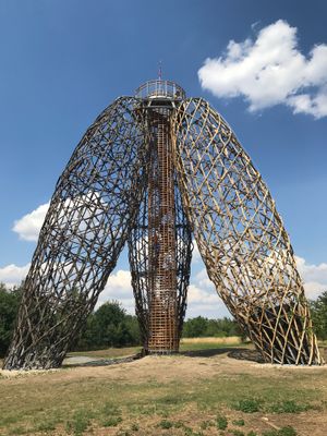 Doubravka XIV is a wooden observation tower in Prague built with acacia timber and supporting legs that guide visitors up a staircase to a viewing platform. The structure rises above the surrounding landscape, offering views from its elevated position.