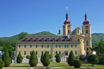 The monastery building features baroque architecture with decorative stone elements, tall windows, and symmetrical design patterns throughout its exterior walls.
