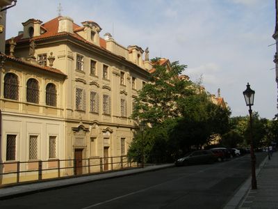 The monastery building stands along the riverbank in Prague 1 district, with its main Baroque complex situated on U Milosrdnych Street and church facade on Dusni Street.
