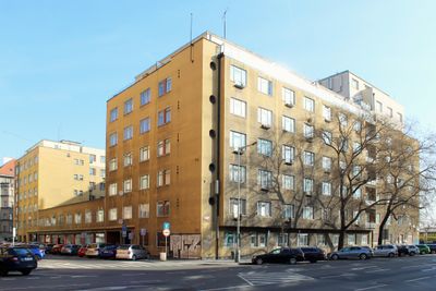 The structure stands at the intersection of Bubenská and Veletržní streets as an early example of functionalist architecture from 1937.