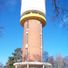 The cylindrical water tower reaches a height of 38.5 meters with an external tank diameter of 11 meters and a lower tube of 7.4 meters.