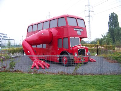 Artist David Černý created this red double-decker bus installation as a motivational symbol for the Czech Olympic team during the 2012 games.