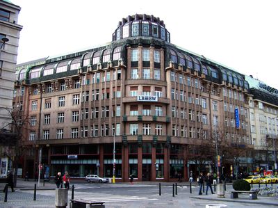 The six-story palace features a central rounded corner with balconies, complemented by two symmetrical wings at Václavské náměstí and Štěpánská Street intersection.