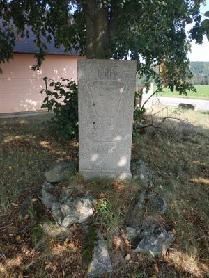 Pomník Jana Husa na jižním konci Plané, kamenná stéla s kalichem a letopočty 1415, 1915 v Plané, části obce Hromnice
