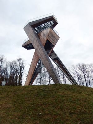 The architectural design incorporates two interlocking seven-shaped forms, creating a structure that stands out among Czech observation towers.