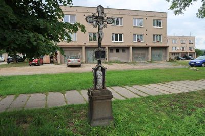 Kříž u bytovek v Neumětelích., pamětní kříž v obci Neumětely, okres Beroun