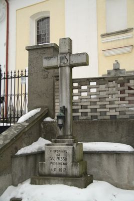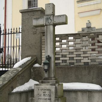 Kříž před kostelem sv. Bartoloměje v Dušejově, pamětní kříž v obci Dušejov, okres Jihlava