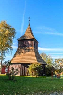 Dřevěná zvonice u kostela svaté Markéty ve středu Vysočan u Nového Bydžova