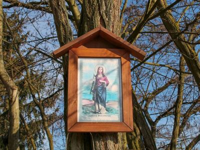 Dřevěný kříž s obrázkem svatého Antonína ve Slatinicích na Malém Kosíři