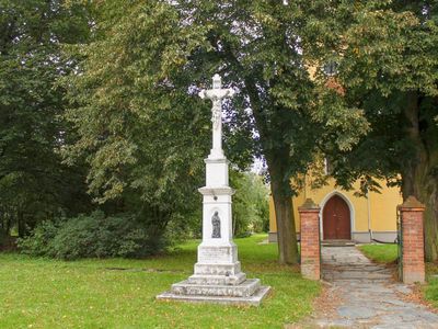 Kříž v Hlušovicích před kostelem, pamětní kříž v obci Hlušovice, okres Olomouc