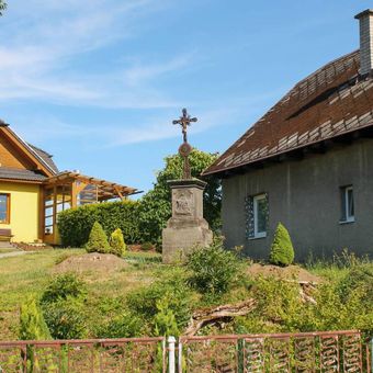 Kříž v Drozdově v zahradě za plotem, pamětní kříž v obci Drozdov, okres Šumperk