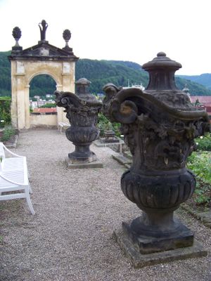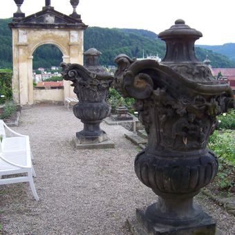 Kamenné ozdobné vázy v Růžové zahradě zámku v Děčíně, plastika v obci Děčín, okres Děčín