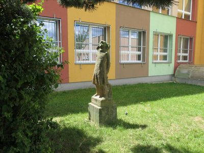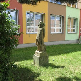 Socha školačky u školy v Zlatnické ulici v Mostě, statue in Most, Czech Republic