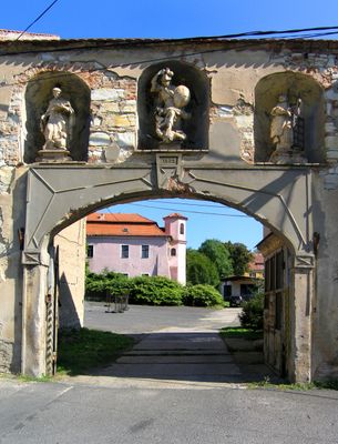 Sochy nad bránou do zámku Velký Újezd, statue in Býčkovice, Czech Republic