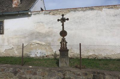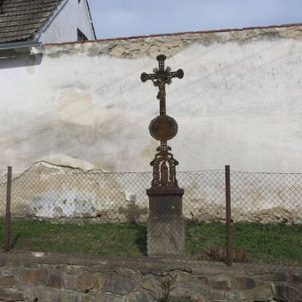 Kříž u zdi statku v Pořešíně, pamětní kříž v obci Kaplice, okres Český Krumlov