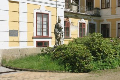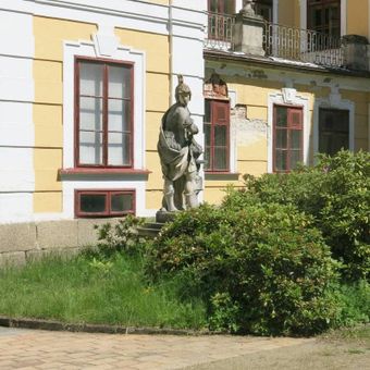 Socha vpravo před průčelím zámku v Chlumu u Třeboně, statue in Chlum u Třeboně, Czech Republic