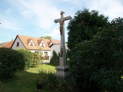 Kříž v Deštné u pamětní desky Tomáše Bílka