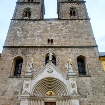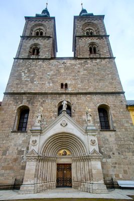The church features twin towers, three naves, and stands within the Premonstratensian monastery complex, displaying both Romanesque and Gothic architectural elements.