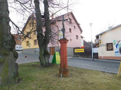Kříž na návsi Četníka J. Bojase ve Stránčicích, pamětní kříž v obci Strančice, okres Praha-východ