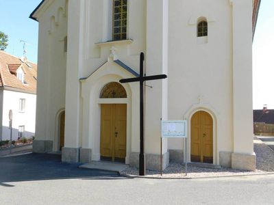 Kříž před kostelem v Souticích, pamětní kříž v obci Soutice, okres Benešov