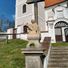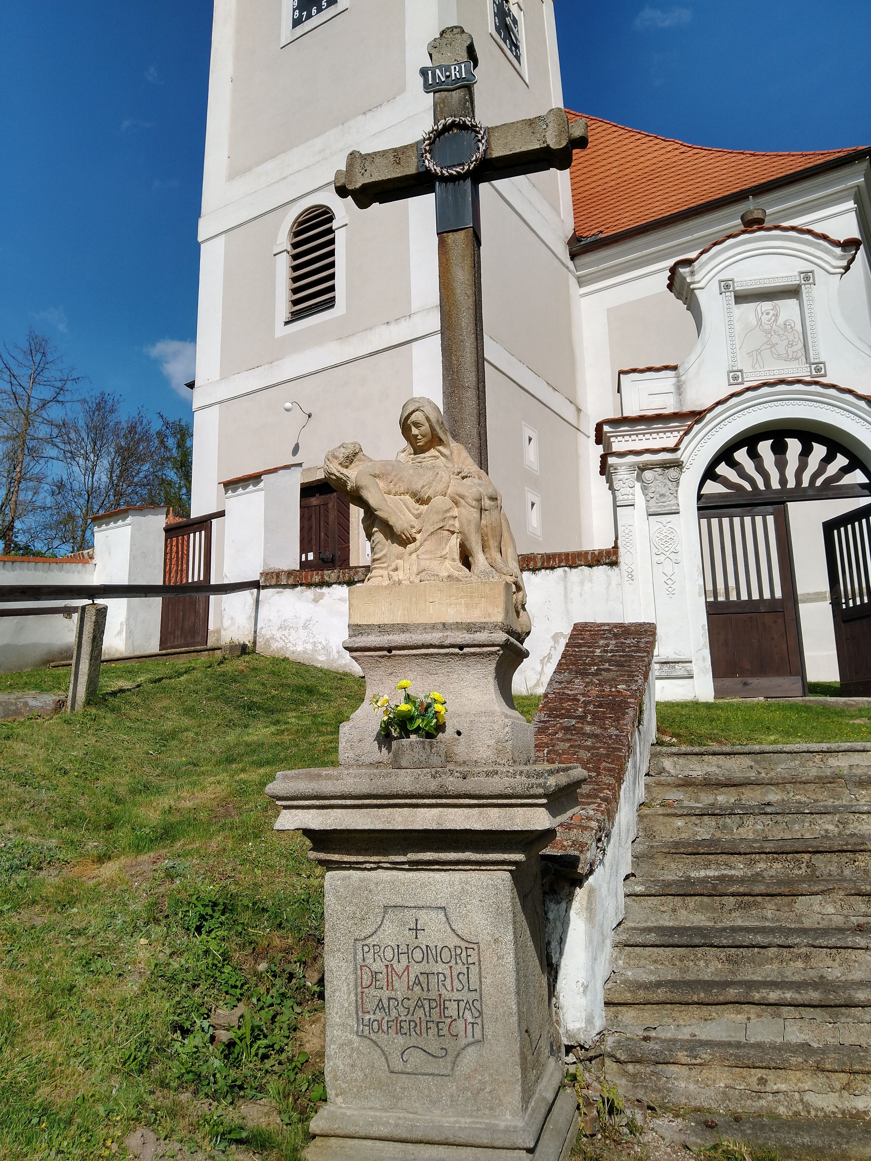 Kříž s pietou v Doudlebech, socha piety pod křížem před kostelem v Doudlebech