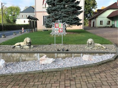 Sochy lvů u obecního úřadu v Horním Podluží, statue in Horní Podluží, Czech Republic