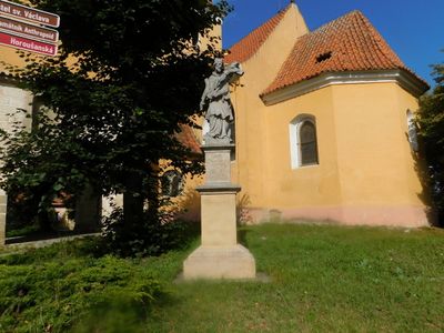 Socha svatého Judy Tadeáše v areálu kostela v Jirnách