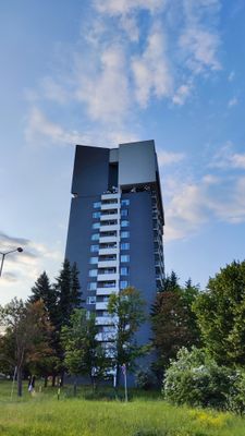 Architect Petr Brauner completed this residential building with an integrated water tower in 1973, incorporating two separate water chambers of 1000 cubic meters.