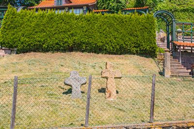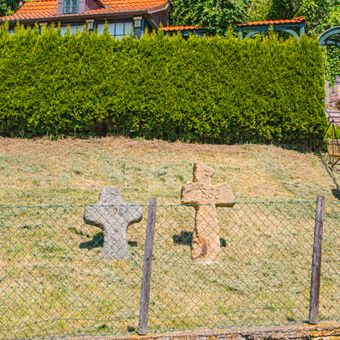 Smírčí kříže, dva novodobé smírčí kříže v zahradě domu čp 285 v Kavánově ulici v městečku Železnice v okrese Jičín