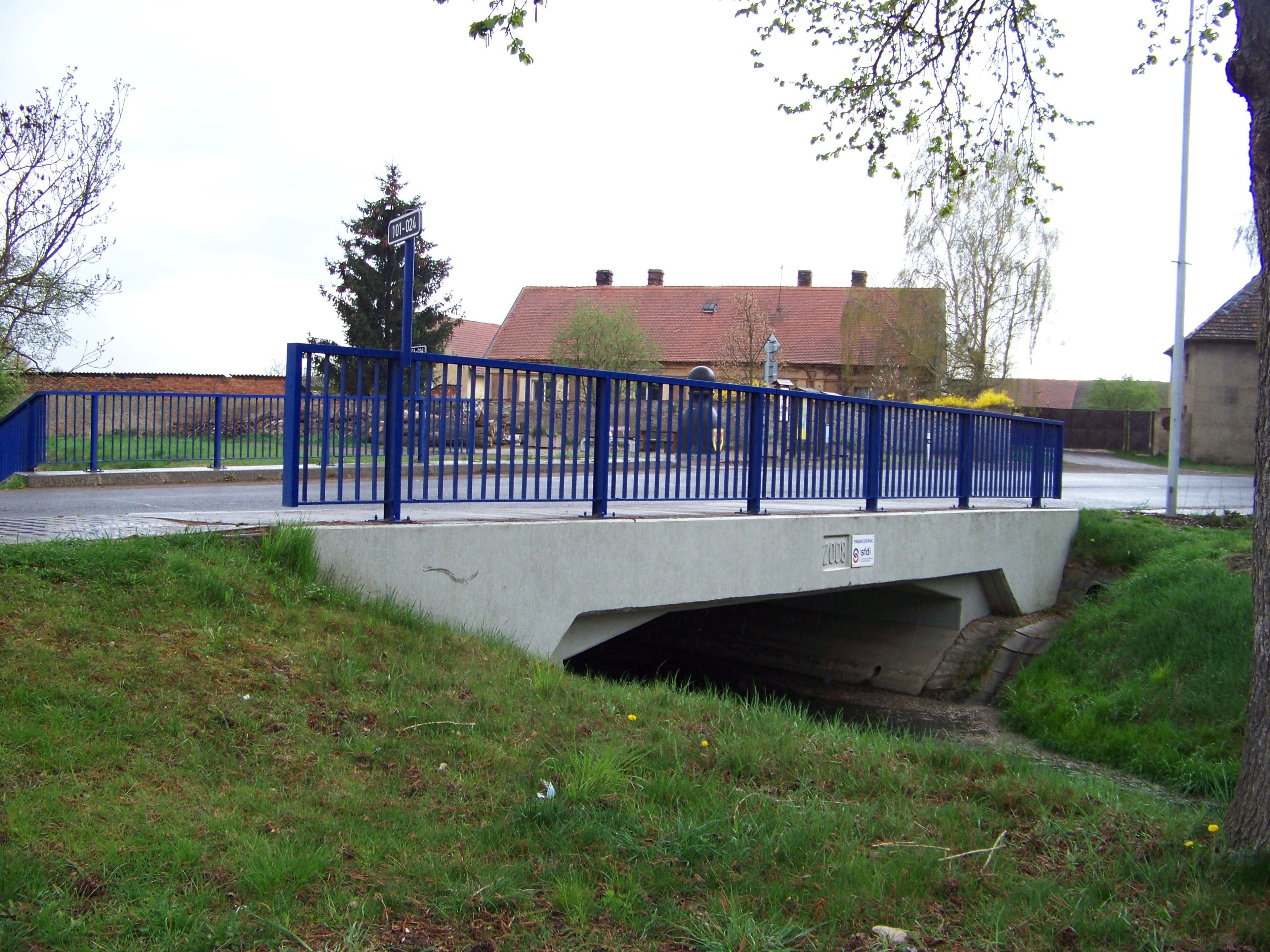 Most přes Radotínský potok v Drahelčicích u obecního úřadu