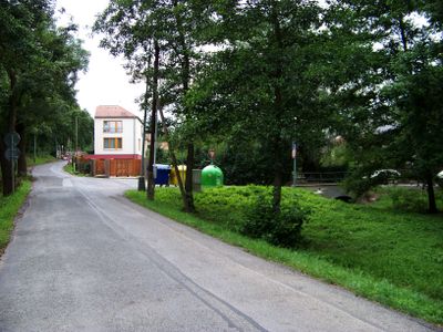Most ulice V Šáreckém údolí přes Šárecký potok na konci revitalizovaného úseku pod Zlatnicí