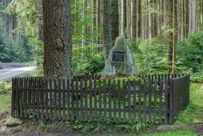 The Memorial of Fallen Foresters stands in stone construction, marking a dedicated space to commemorate forestry workers who lost their lives during wartime service.