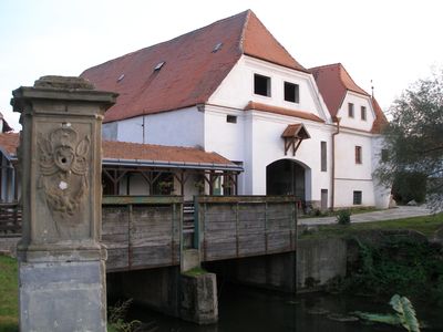 The mill structure incorporates specific architectural elements of South Moravian design, including a distinctive gabled roof and stone foundation.