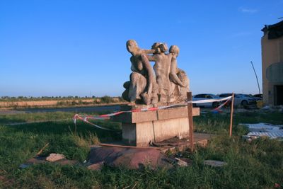 Alegorie úrody a zemědělství, sousoší trojice dívek před zemědělským areálem v Moravské Nové Vsi