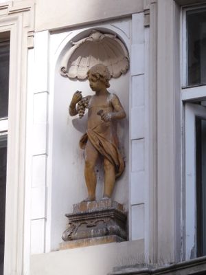 Sochy vlevo od štítu domu Staroměstské náměstí 7