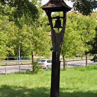 Bell tower in Mirošovice, vidláková zvonička se stříškou u křižovatky ulic U Zvoničky a Hlavní v Mirošovicích, okres Praha-východ