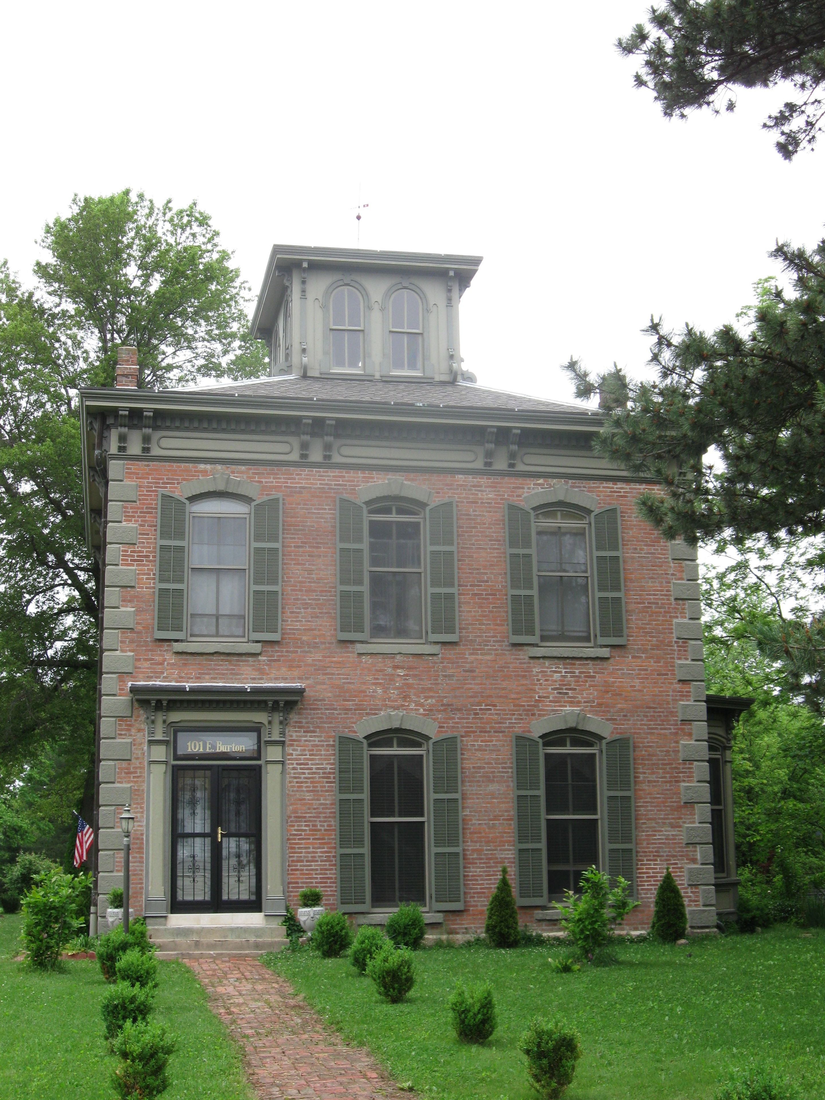 The two-story residence at 101 East Burton Street exhibits Italianate architecture with tall windows, decorative cornices, and a modified T-shaped floor plan.