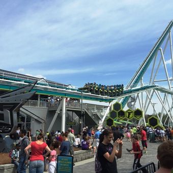 The track crosses above the park's main entrance at low altitude and gives visitors a preview of the ride as they arrive. This passage happens shortly after the first drop and sends the trains directly over the ticket booths.