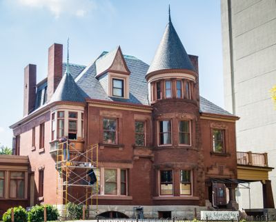 Butler House features an asymmetrical facade with detailed woodwork, multiple bay windows, and varied rooflines characteristic of Queen Anne architecture.