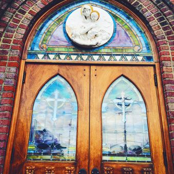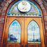 St. Benedict Catholic Church features Spanish-influenced architecture, with a large central nave, side chapels, and stained glass windows depicting biblical scenes.
