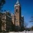 The three-story red brick building features a conical-roofed clock tower, open belfry, projecting bay windows, and Richardsonian Romanesque architectural elements.