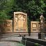 The Westinghouse Memorial features three bronze panels with Norwegian granite base, displaying intricate sculptures near a reflecting lily pond.