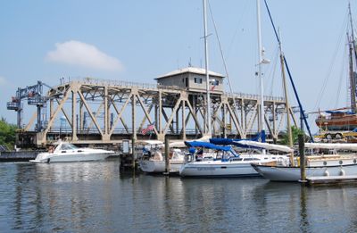 The current steel truss bridge, constructed in 1984, replaced an 1875 steel swing bridge, which had succeeded the original wooden drawbridge from 1819.